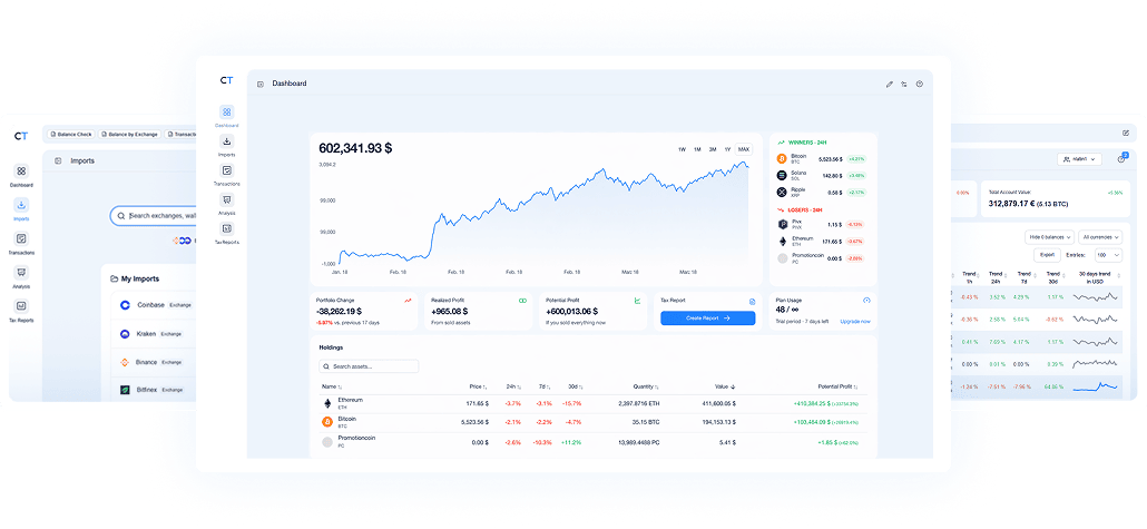 Sign up and import unlimited transactions for 7 days — no credit card required. The trial lets you explore portfolio tracking and analytics, but tax reports are not included. After the trial, choose a paid plan to keep importing transactions and generate tax reports, or stay on the free plan with portfolio view only (no new imports, no tax reports).